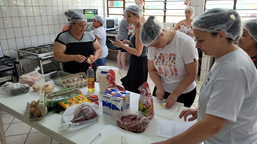 Nos dias 30 e 31 de janeiro as cozinheiras das escolas municipais passaram pela capacitação anual das merendeiras, ministradas pela nutricionista Ana Claudia Jochem, responsável pela alimentação escolar no município. Essas capacitações são de extrema importância para orientar quanto aos cuidados higiênico sanitários que devem ser tomados desde o recebimento, preparo e oferta dos alimentos, com o objetivo de fornecer um alimento seguro e nutritivo para nossas crianças. Durante a capacitação também foram apresentadas receitas que serão adicionadas ao cardápio escolar no ano de 2023, como o strogonoff, bolo de beterraba e sorvete de frutas congeladas.