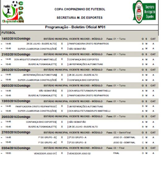 Foi realizado no dia de hoje, (02) , às 10h a sessão técnica da Copa Chopinzinho de Futebol, o evento terá início no dia 14 de fevereiro. Acompanhe a programação completa dos jogos que acontecem no Estádio Municipal Vicente Muckei.