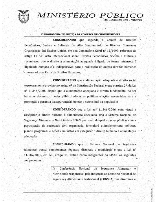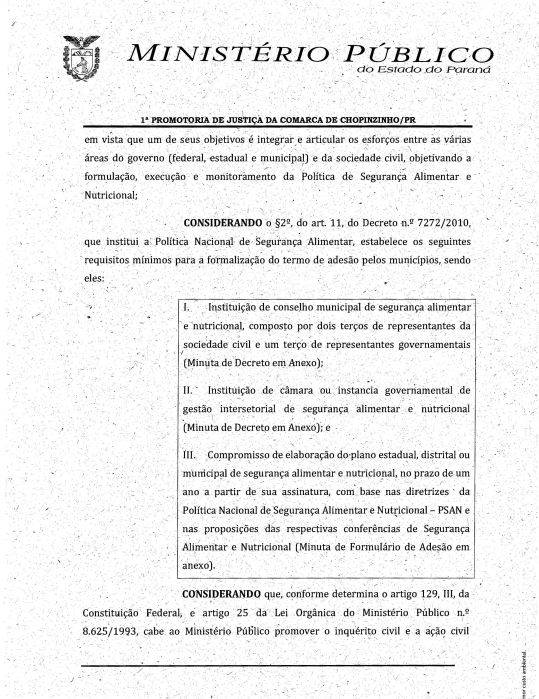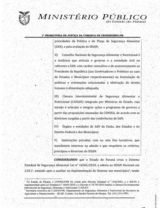 A 1ª Promotoria de Justiça da Comarca de Chopinzinho, emitiu recomendação administrativa 07/2015, para que o Município faça adesão ao sistema nacional de segurança alimentar, conforme segue em anexo: