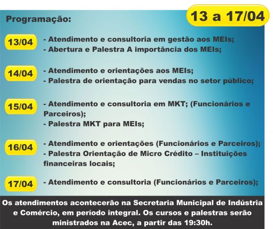 Durante a semana, na Secretaria de Indústria e Comércio, será prestado atendimento e consultoria em gestão direcionada aos Microempreendedores Individuais, em horário de expediente. “Estaremos disponibilizando todas as informações necessárias para que o microempreendedor possa formalizar seu negócio ou ainda definir diretrizes de trabalho para que o seu empreendimento seja bem sucedido”, disse o secretário de Indústria e Comércio, André Budine. O mesmo destacou que na quarta-feira, 15, a consultoria disponibilizada terá foco no tema Estratégias de Marketing.