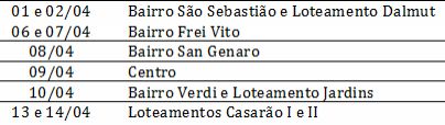 Somente em 2015, três focos de larvas do mosquito da dengue foram identificados em três bairros do município, sendo bairro Verdi, bairro São Sebastião e bairro Frei Vito. “Assim que identificados os focos, desenvolvemos uma ação de bloqueio em um raio de 400 metros, nas intermediações do local identificado, que consiste na realização de uma pesquisa larvária, limpeza e eliminação do criadouro e a orientação e conscientização da população até que o foco seja completamente eliminado”, explicou o coordenador da Vigilância em Saúde.