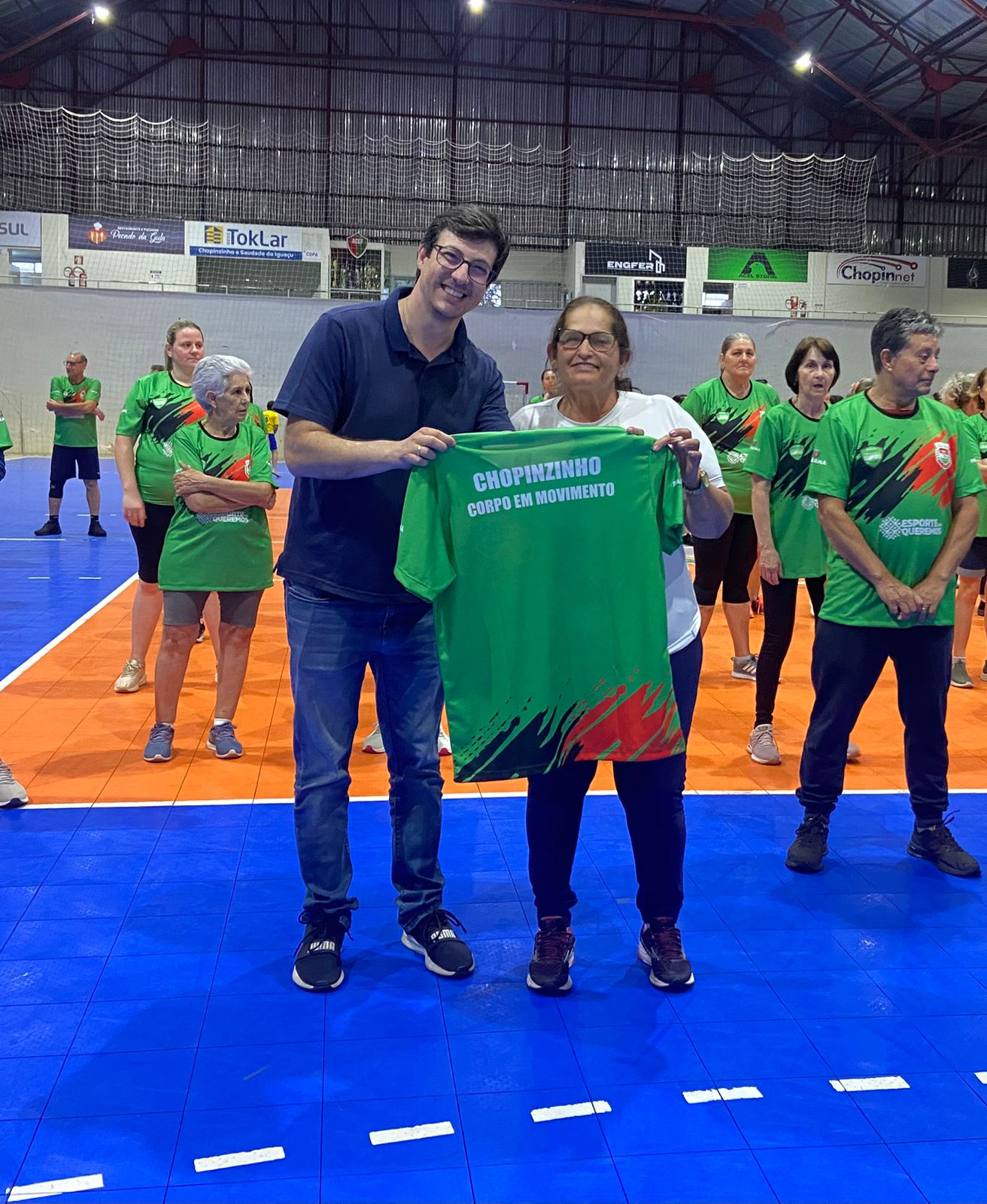 Na noite da última quinta-feira (06), a Administração Municipal realizou a entrega das camisetas do projeto Corpo em Movimento, no Ginásio Deonisto Debona. O programa atende cerca de 130 participantes por mês, com aulas conduzidas pela professora Rosani em nove turmas, distribuídas nos períodos da manhã, tarde e noite.