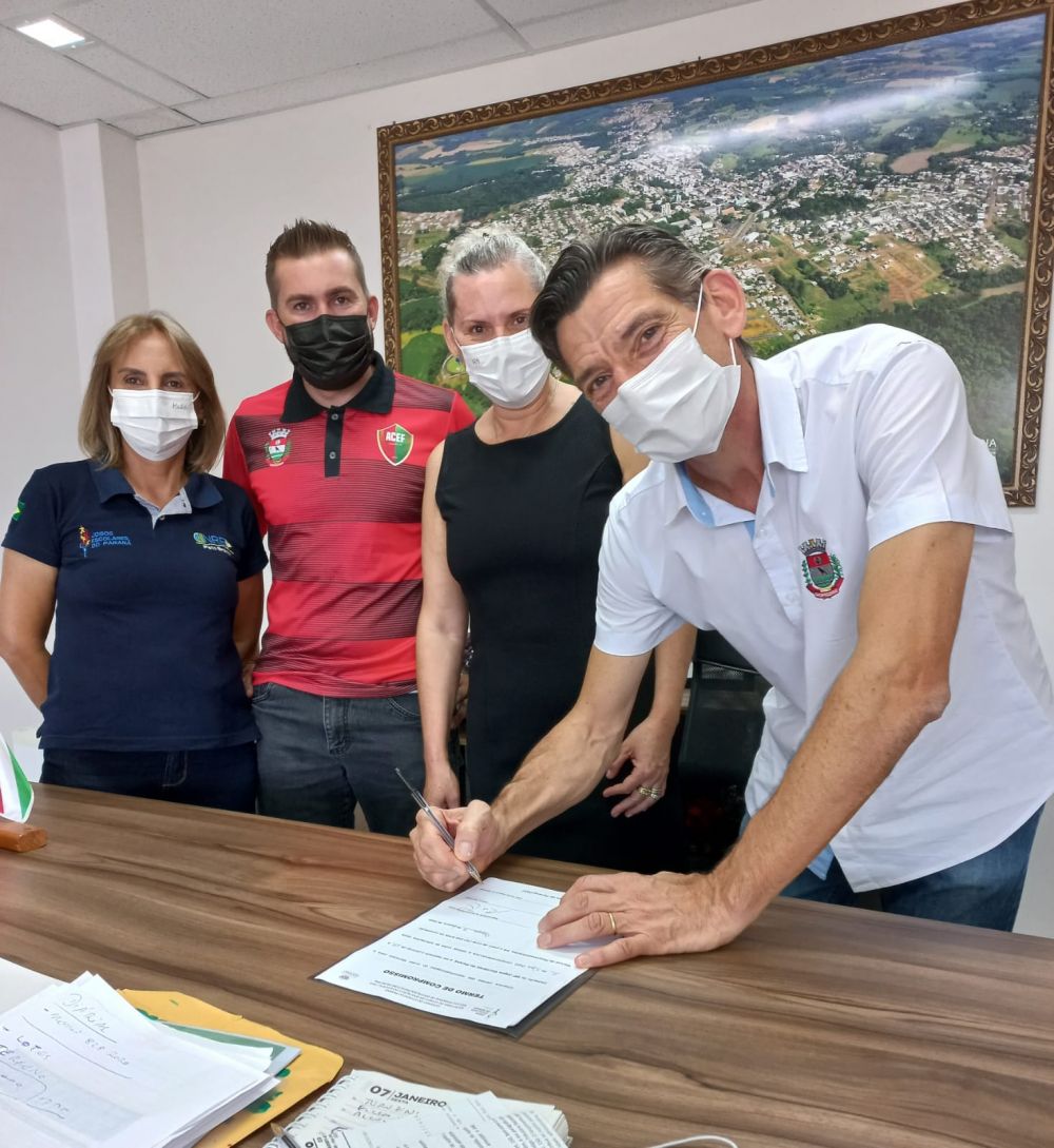 Na quinta-feira (17), os representantes do Núcleo Regional de Educação a senhora Iara Lúcia Tecchio Mezomo, Chefe do Núcleo Regional, o senhor Fábio Andrei França, técnico do Núcleo e também a senhora Joceli Fasolin, Coordenadora dos Jogos Escolares juntamente com o prefeito Neco, o Diretor da Divisão de Esportes, Luiz Eduardo Andolhe e a senhora Roseli Lorenzi, Oficial Administrativo da Sec. de Educação estiveram reunidos para formalizar o termo de compromisso quanto à realização do evento.