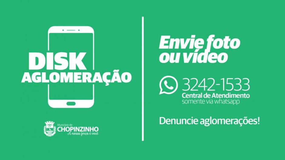 Na busca de minimizar a proliferação do Coronavírus em Chopinzinho (Covid-19), a prefeitura disponibilizou na tarde de quarta-feira (08), mais uma plataforma, o Disk Aglomeração. Através deste canal, a população pode ajudar na fiscalização do comércio e também de lugares particulares onde aglomere mais de 10 pessoas, as quais não estejam cumprindo as medidas distanciamento de no mínimo um metro e meio.