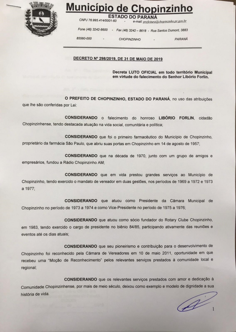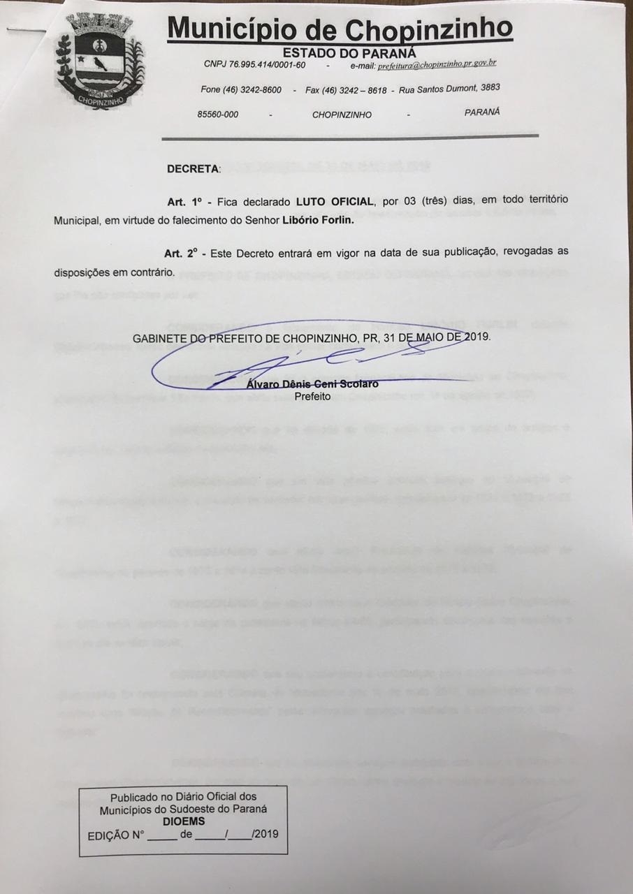 A Administração Municipal de Chopinzinho decretou luto oficial de três dias em memória de um dos pioneiros do Município, Libório Forlin, que faleceu nesta sexta-feira (31).O decreto será publicado no Diário Oficial do Município de segunda-feira (03).
