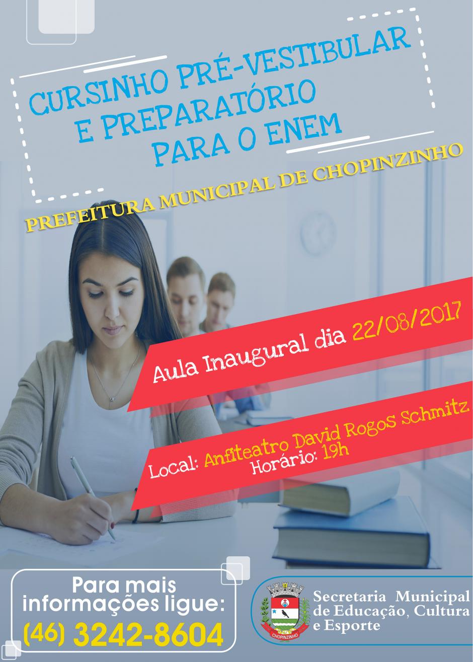 Na próxima terça-feira (22), às 19h, no Anfiteatro David Rogos Schimtz, acontece a Aula inaugural do Cursinho preparatório para Enem e Vestibular da Prefeitura de Chopinzinho. Neste primeiro encontro, haverá presença de autoridades, apresentaç...