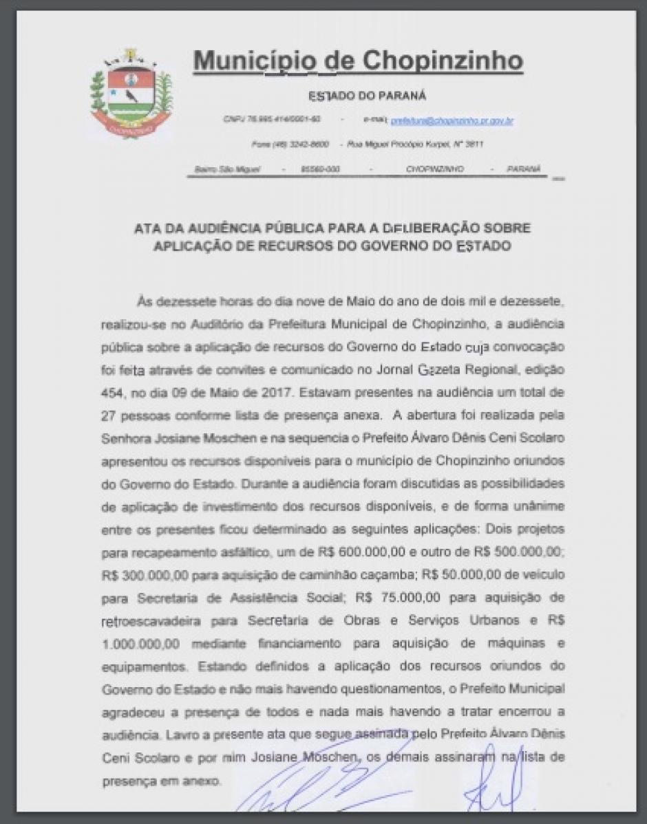 No dia 09 de maio, no Auditório da Prefeitura Municipal de Chopinzinho, aconteceu a Audiência Pública para deliberação sobre aplicação de recursos do Governo do Estado. Foram 27 presentes, que puderam verificar os recursos disponíveis para o ...