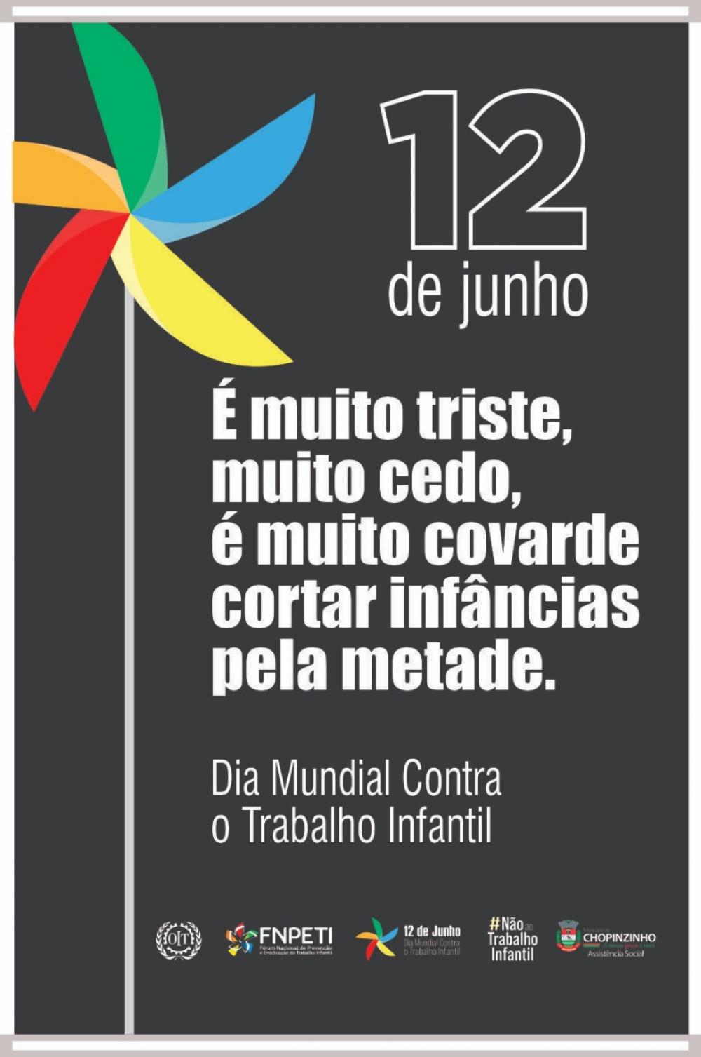 O dia 12 de junho traz a marca da Campanha Mundial Contra o Trabalho Infantil. Chopinzinho também está nesta luta. Em alusão a data, serão distribuídos cartazes pela cidade e entrevistas nas rádios locais, visando orientação da população. N...