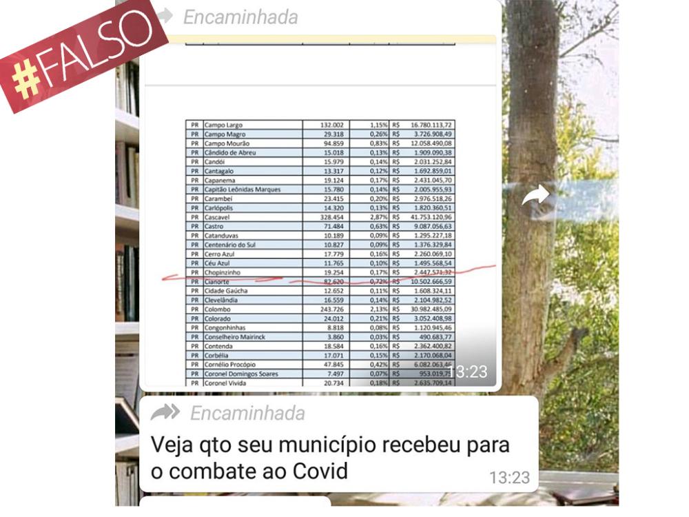 Durante o final de semana circulou pelo aplicativo de mensagens WhatsApp, uma tabela com a marca do Senado Federal, relação de municípios por estado e o quanto cada um receberia para combater o Covid-19. Junto segue uma imagem destacando a cidade ...