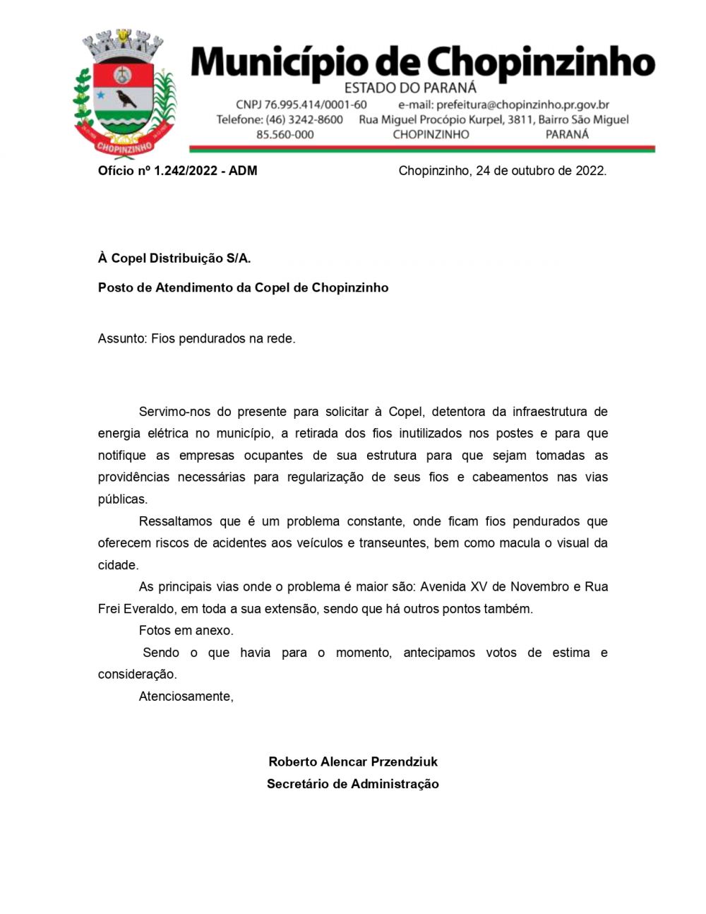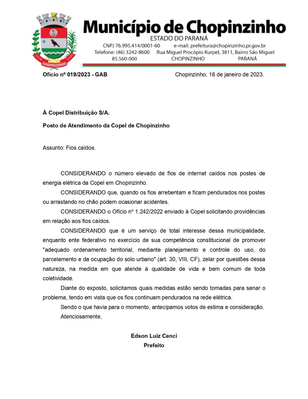 No intuito de evitar acidentes aos motoristas, ciclistas, pedestres e a população em geral, a Administração Municipal encaminhou à Copel no ano de 2022 e em janeiro de 2023, a solicitação, juntamente com a câmara de vereadores, para que a retirada desse material fosse realizada.