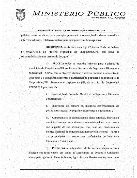 A 1ª Promotoria de Justiça da Comarca de Chopinzinho, emitiu recomendação administrativa 07/2015, para que o Município faça adesão ao sistema nacional de segurança alimentar, conforme segue em anexo: