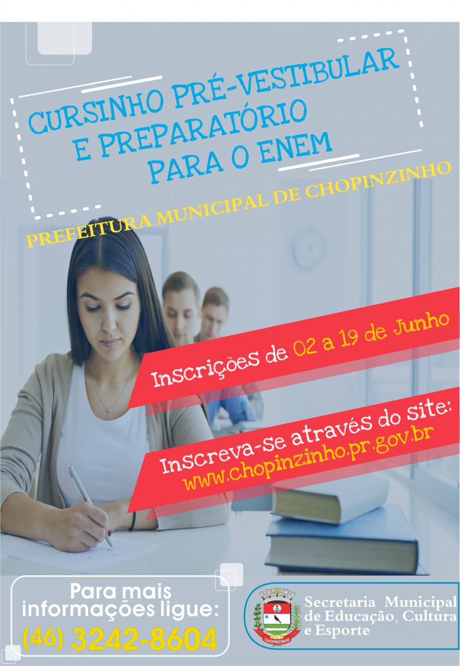 Até o dia 19 de junho estão abertas as inscrições para o Cursinho Pré-Vestibular e Preparatório para o ENEM (Exame Nacional do Ensino Médio). O cursinho é ofertado gratuitamente pela Prefeitura de Chopinzinho, atrav...