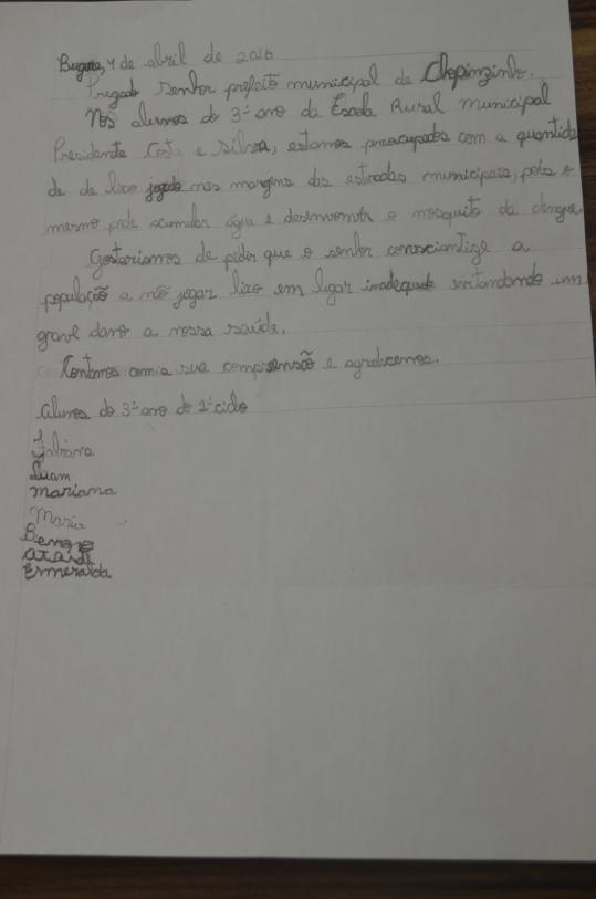 Uma turma de pequenos cidadãos, moradores do Bugre, tem algo do que reclamar em sua comunidade: lixo jogado na beira de estrada. Sete alunos do 3º ano do 1º ciclo escreveram para a Administração Municipal, preocupados com as consequências do li...
